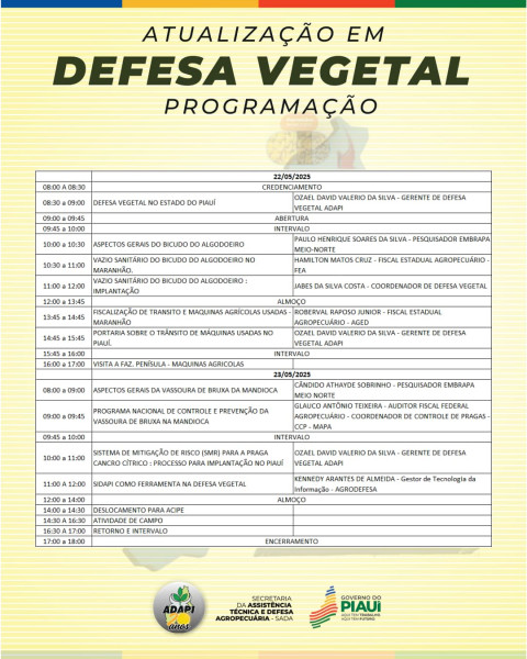Entre os dias 21 e 23 de maio de 2025, o CEEPRU Frei José Apicella, no município de Guadalupe, no sul do Piauí, sediará o evento “Atualização em Defesa Vegetal”, promovido pela Agência de Defesa Agropecuária do Piauí (ADAPI). O encontro tem como público-alvo os fiscais estaduais agropecuários da Adapi, além de representantes de instituições parceiras envolvidas no setor agrícola e na proteção fitossanitária do estado.