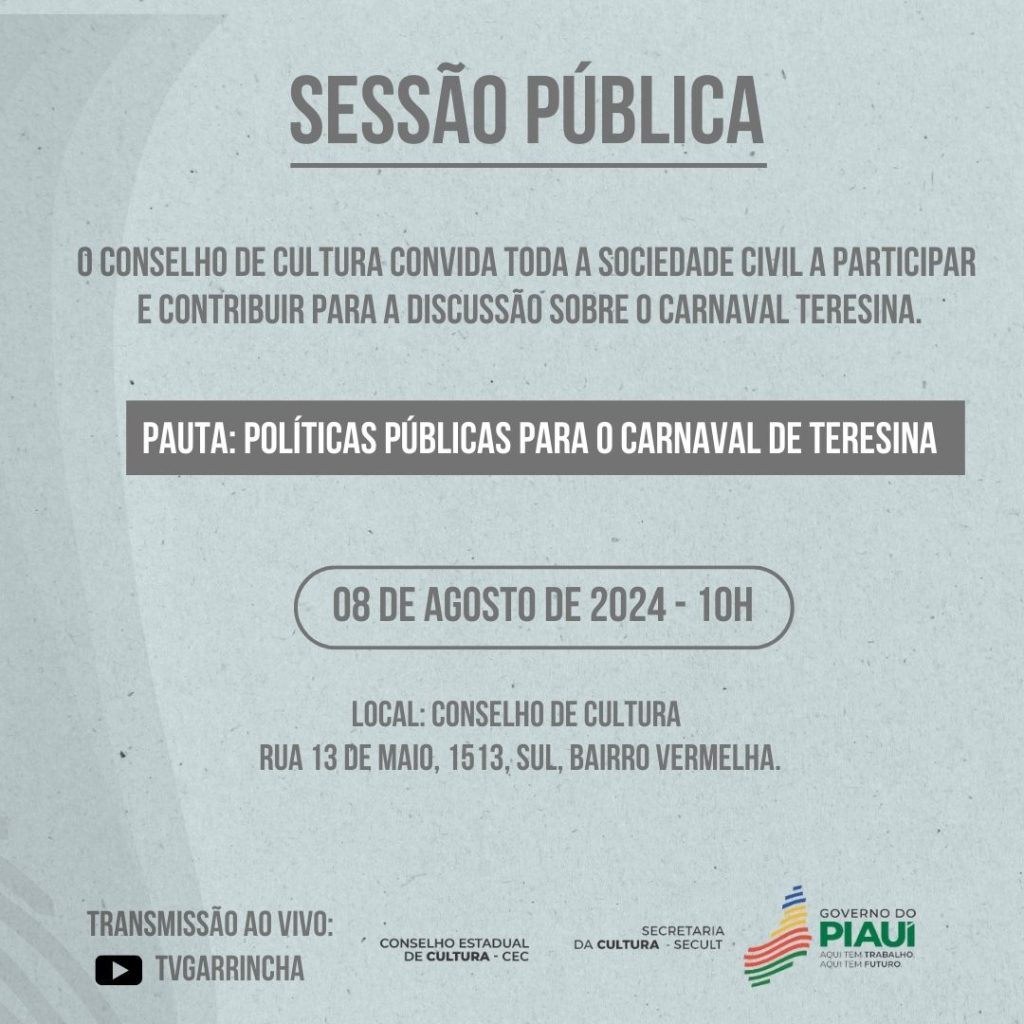 O Conselho Estadual de Cultura convida toda a sociedade para participar de uma sessão aberta que será realizada no dia 08 de agosto, quinta-feira, às 10h, em sua sede. O principal tema da reunião será a discussão da política pública voltada para o Carnaval de Teresina, um dos eventos culturais mais tradicionais e significativos da cidade.