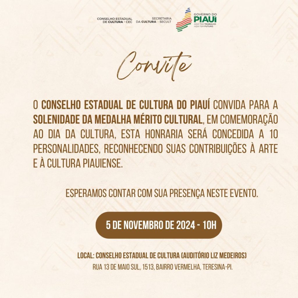 O Conselho Estadual de Cultura do Piauí convida a todos para a solenidade de entrega da Medalha da Ordem do Mérito e do Prêmio Cultural, que ocorrerá amanhã, 5 de novembro de 2024, às 10h, no auditório Liz Medeiros, Rua 13 de Maio, Sul, 1513, Bairro Vermelha. (Sede do Conselho)