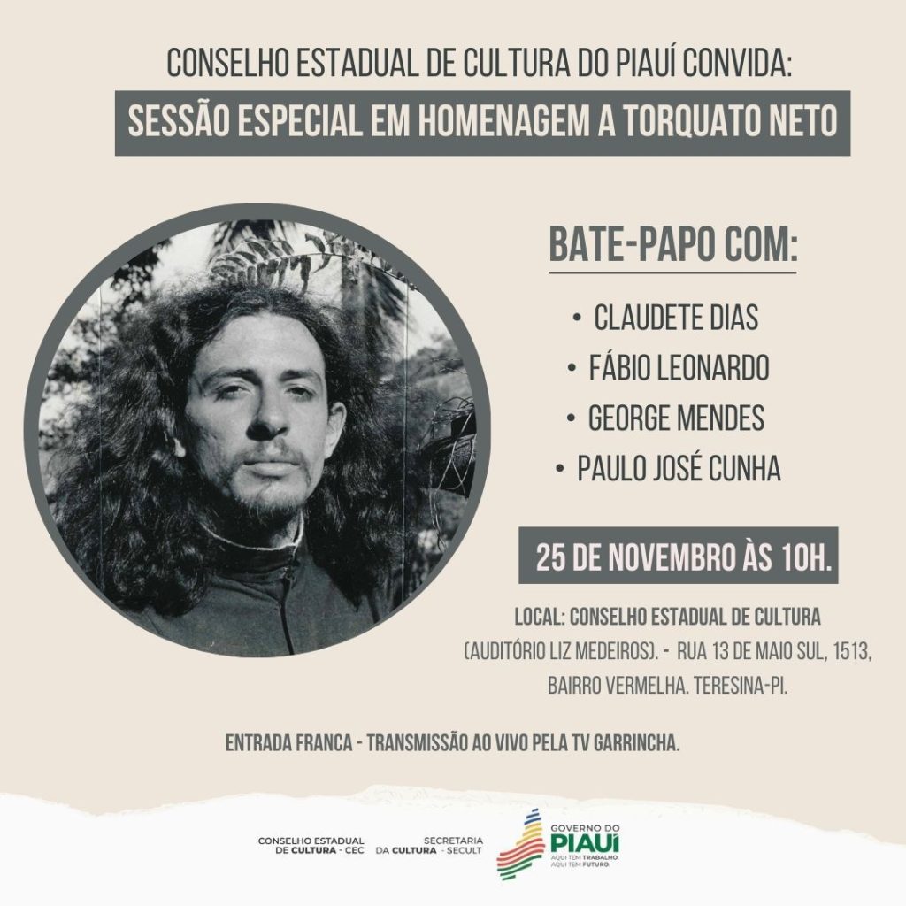 O Conselho Estadual de Cultura do Piauí convida para uma sessão especial em homenagem a Torquato Neto, ícone da cultura brasileira, que ocorrerá na próxima segunda-feira, 25 de novembro, às 10h, no Auditório Liz Medeiros, na sede do Conselho Estadual de Cultura, localizada na Rua 13 de Maio Sul, 1513, em Teresina.