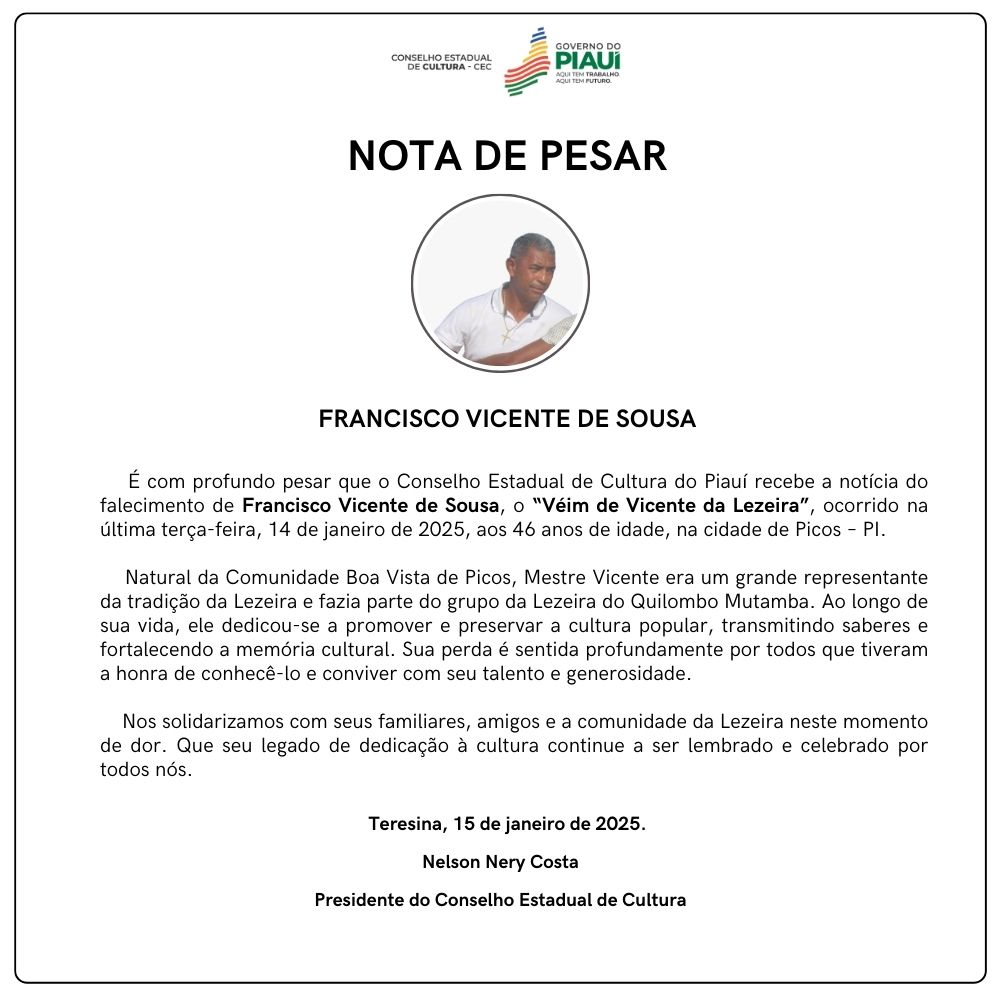 É com profundo pesar que o Conselho Estadual de Cultura do Piauí recebe a notícia do falecimento de Francisco Vicente de Sousa, o “Véim de Vicente da Lezeira”, ocorrido na última terça-feira, 14 de janeiro de 2025, aos 46 anos de idade, na cidade de Picos – PI.