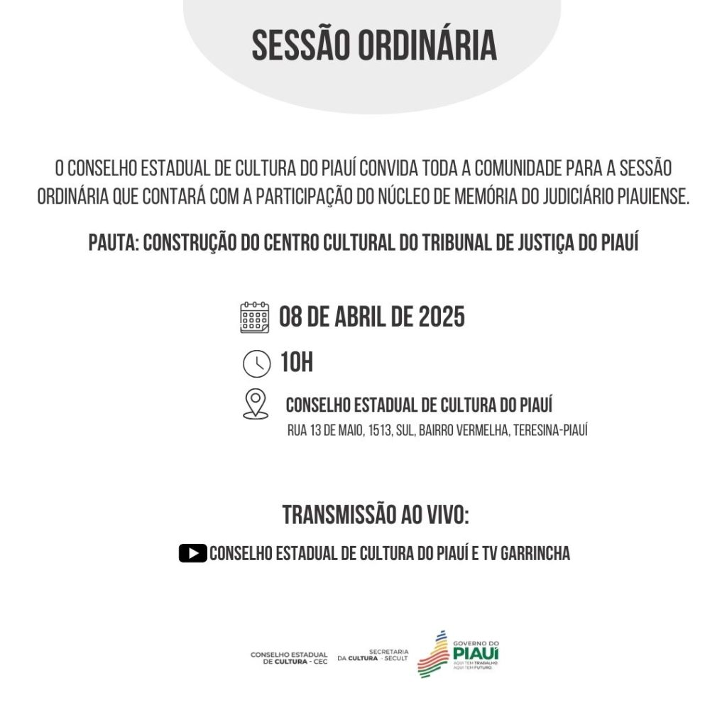 O Conselho Estadual de Cultura do Piauí (CEC-PI) realizará nesta terça-feira, 8 de abril de 2025, às 10h, sessão ordinária em parceria com o Núcleo de Memória do Judiciário Piauiense.