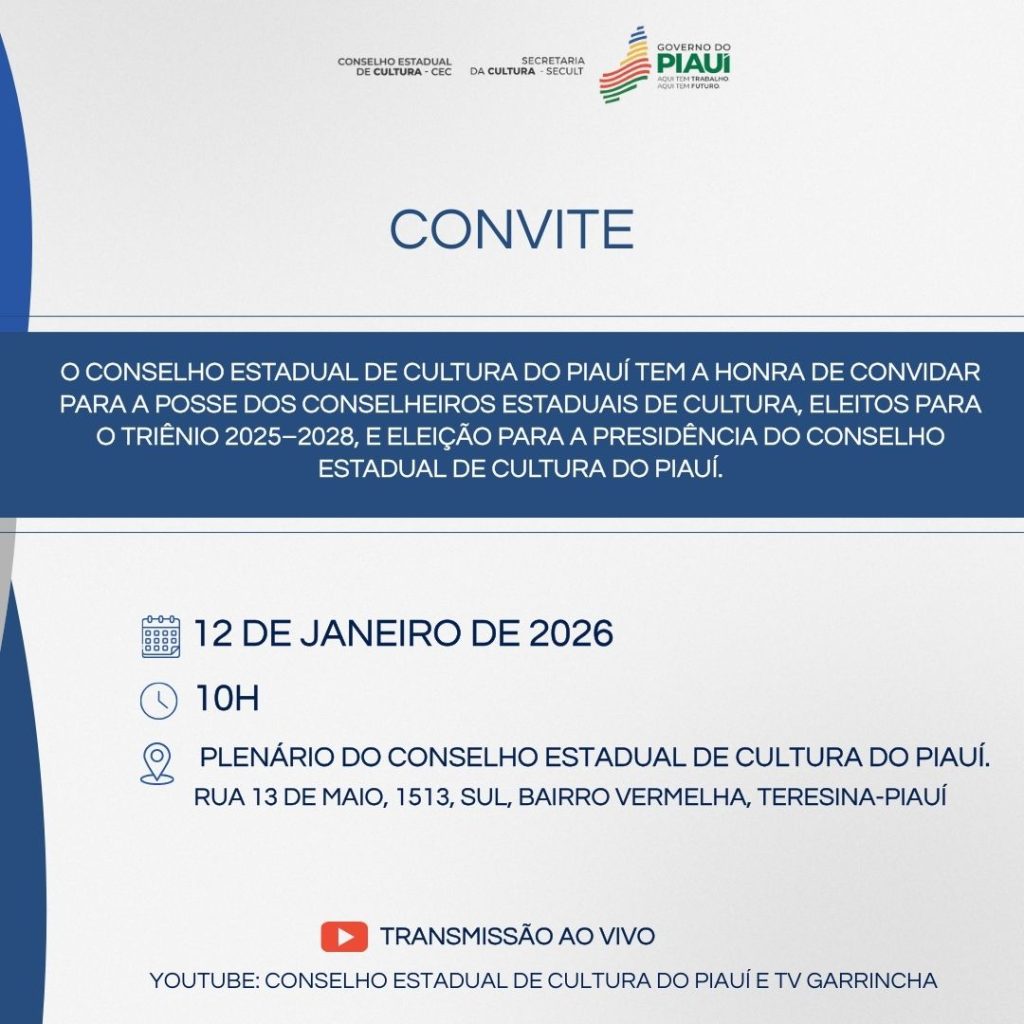 O Conselho Estadual de Cultura do Piauí realizará a posse dos Conselheiros Estaduais de Cultura, a serem empossados para o mandato de três anos (2026–2028), conforme o Decreto nº 24.286, de 26 de dezembro de 2025, publicado no Diário Oficial do Estado do Piauí.