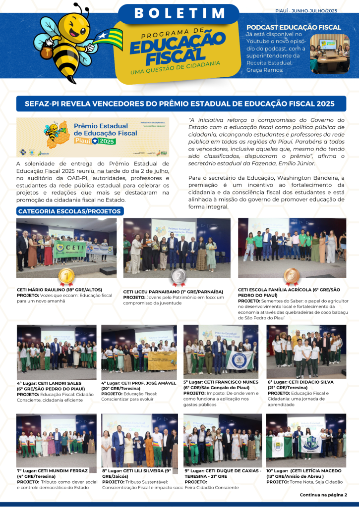 O Grupo de Educação Fiscal do Estado do Piauí (GEFE-PI), composto por representantes da Secretaria da Fazenda (Sefaz-PI), Controladoria-Geral do Estado (CGE-PI), Secretaria da Educação (Seduc-PI) e Receita Federal, publicou, nesta terça-feira (12), mais uma edição do Boletim do Programa de Educação Fiscal, reunindo as principais ações realizadas nos meses de junho e julho de 2025.