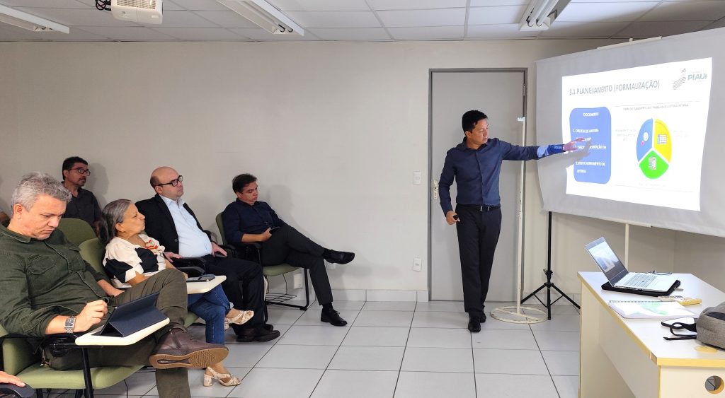 Durante o encontro, o auditor governamental Bruno Figueiredo, gerente de Auditoria da CGE, apresentou os principais pontos do Manual de Auditoria, destacando diretrizes, padronização de procedimentos e alinhamento às boas práticas da área.