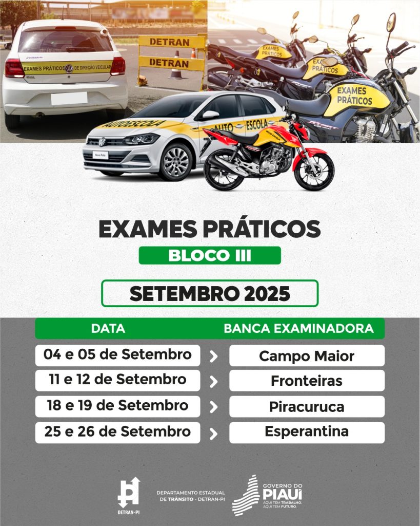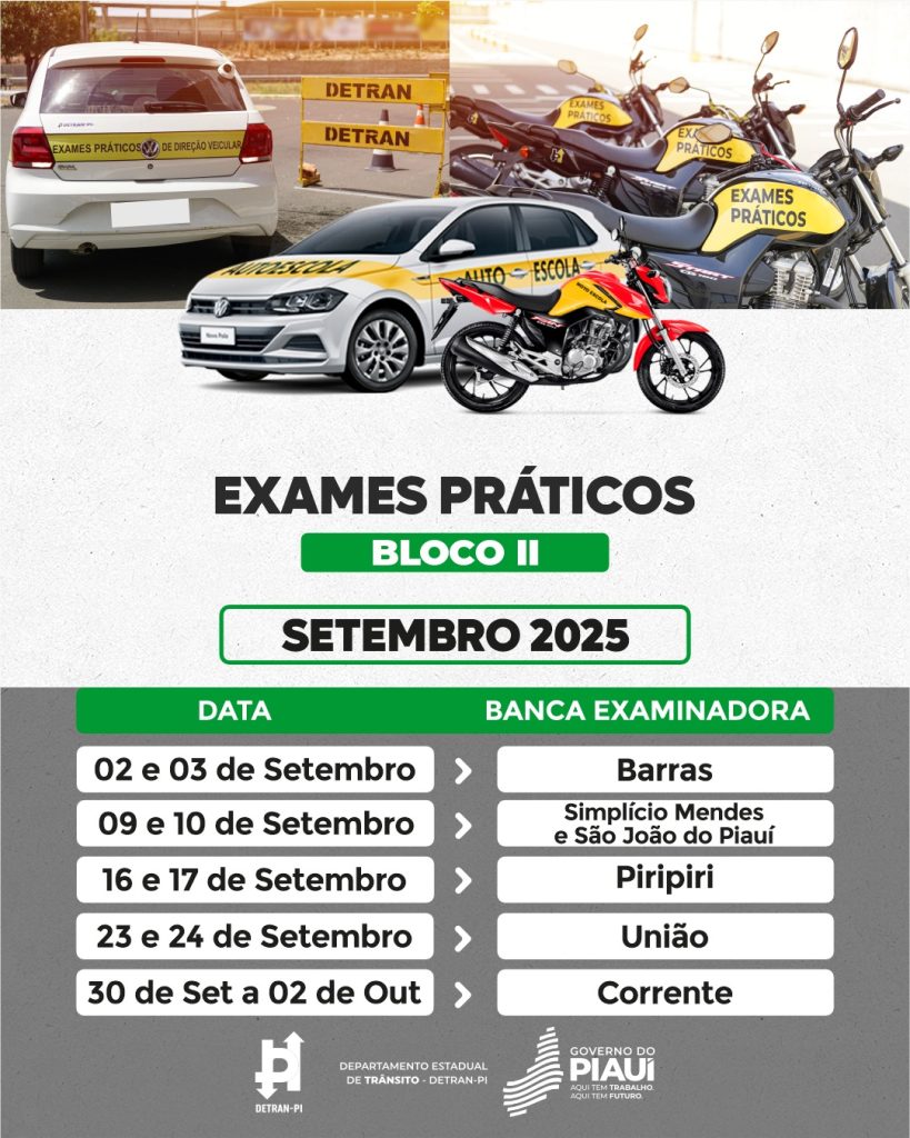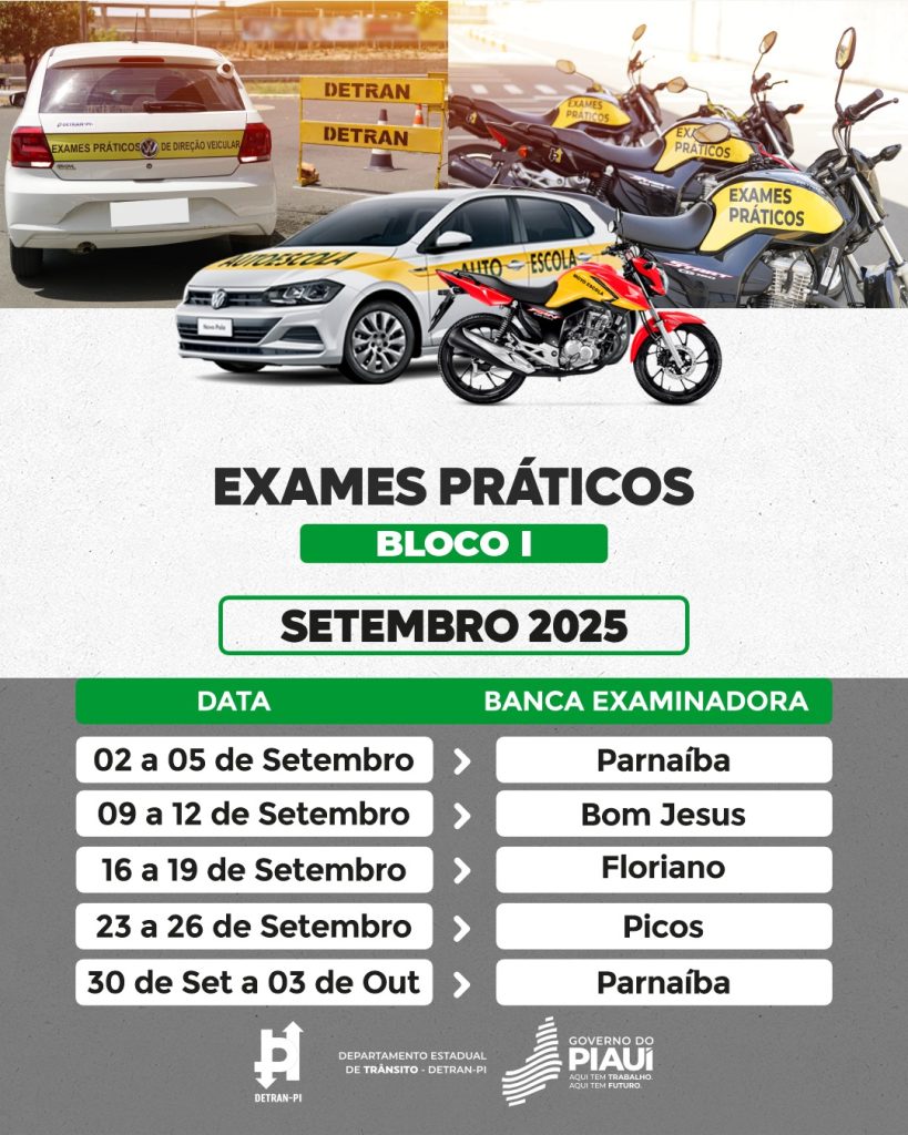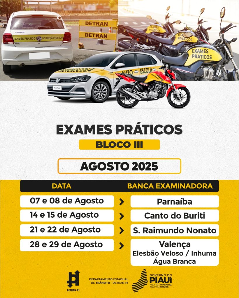 O Departamento Estadual de Trânsito (Detran-PI) disponibiliza o cronograma de exames práticos (balizas) para os meses de agosto e setembro de 2025. Neste período, a agenda é dividida em blocos para cidades com diferentes disponibilidades de datas.