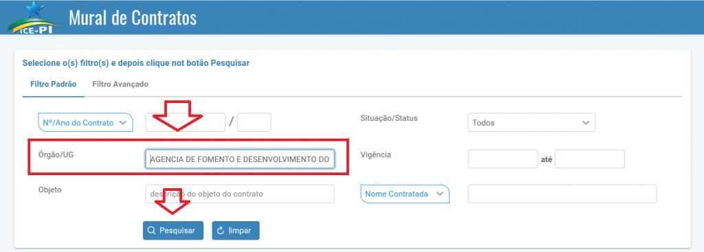 2º PASSO: digitar no campo “Órgão/UG” a palavra “AGENCIA DE FOMENTO E DESENVOLVIMENTO DO ESTADO DO PIAUI S.A” e logo após, confirmar clicando em “PESQUISAR, conforme demonstrado na imagem abaixo: