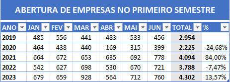 O Piauí encerrou o primeiro semestre de 2023 com 4.302 empresas abertas, o que representa um crescimento de 13,57% em relação ao mesmo período do ano passado, quando foram registrados 3.788 negócios. Em relação aos encerramentos, foram baixadas 2.250 empresas no primeiro semestre, contra 1.916 do ano anterior. Os dados constam do balanço realizado pela Junta Comercial do Piauí (Jucepi) e consideram apenas as empresas registradas no sistema online Gov.Pi Empresas.