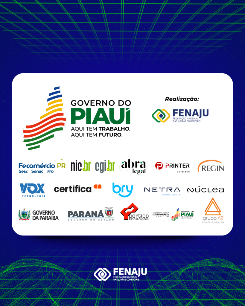 Agradecemos, em especial, ao apoio institucional do Governo do Piauí/ CCOM, Governo do Paraná, e Governo da Paraíba, bem como a parceria das empresas: VOX, REGIM, A2 Paralegal, Certifica, Abralegal, Fecomércio Paraná, CIP S.A., Nic.Br, Netra Tecnologia, Núclea, e Printer do Brasil. Essa parceria institucional e empresarial reforça o compromisso do ENAJ 2025 com o fortalecimento coletivo, a inovação e o aprimoramento do ambiente de negócios no país, promovendo um encontro enriquecedor para a troca de experiências, modernização dos serviços e valorização do empreendedorismo.