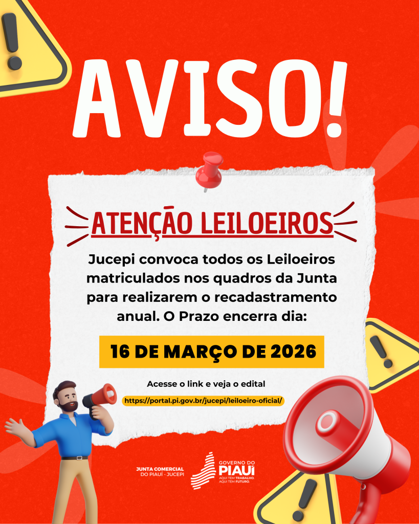A Junta Comercial do Estado do Piauí (JUCEPI), por intermédio do EDITAL Nº 01/2026 publicado no DOEE PI de nº 08, datado de 14 de janeiro de 2026, convoca os leiloeiros matriculados nos quadros da Jucepi para o recadastramento anual. O procedimento deverá ser efetuado até o dia 16 de março de 2026, prazo final para atualização cadastral junto ao órgão.