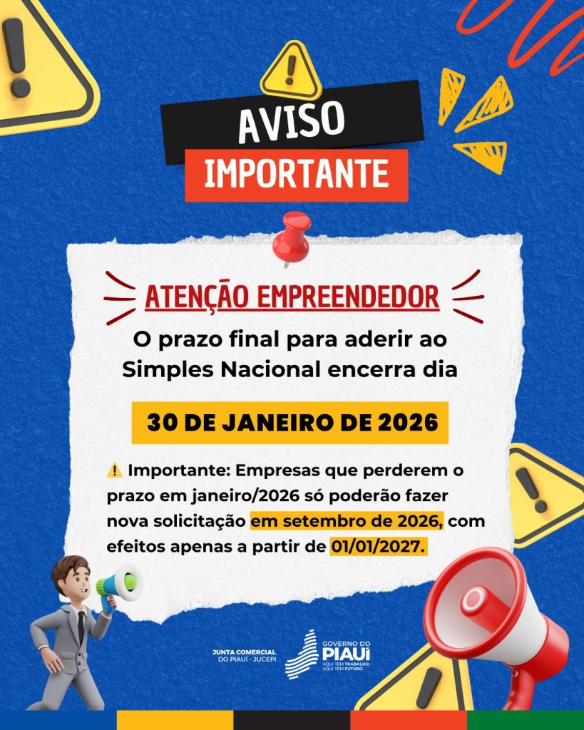 Empresas que perderem o prazo em janeiro de 2026, só poderão fazer nova solicitação em setembro de 2026, com efeito a partir de 01/01/ 2027. A Jucepi reforça que é fundamental que os empreendedores acompanhem a situação do pedido e regularizem eventuais pendências dentro do prazo estabelecido pela Receita Federal.