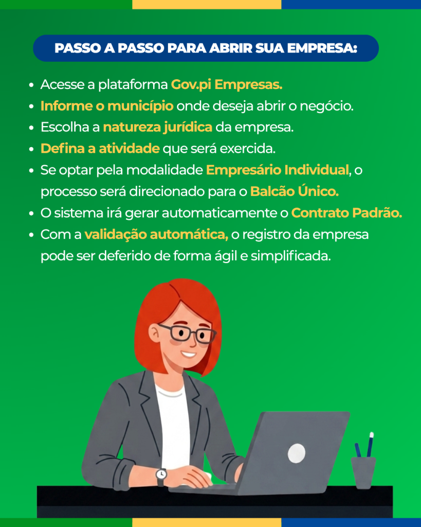 Trata-se de um processo online que é simples e rápido por meio da plataforma Gov.pi Empresas, onde o empresário informa o município onde deseja abrir o negócio, escolhe a natureza jurídica e define a atividade que será exercida em seu empreendimento, dentre outras etapas.