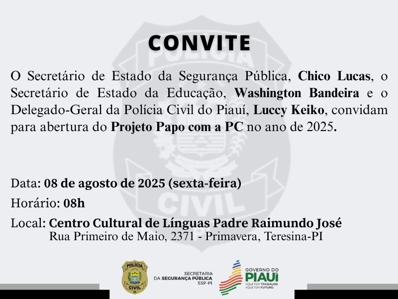 As Secretarias de Estado da Segurança Pública e da Educação, e a Polícia Civil do Piauí iniciam na próxima sexta-feira (08/08), as atividades relativas ao Projeto Papo com a PC no ano de 2025. A abertura dos trabalhos acontecerá no Centro Cultural de Línguas Padre Raimundo José, no bairro Primavera, em Teresina, com a presença de representantes das instituições e alunos da rede estadual de ensino. Durante o evento será realizada palestra com o Delegado Charles Pessoa, coordenador do Departamento de Repressão às Ações Criminosas Organizadas (DRACO).
