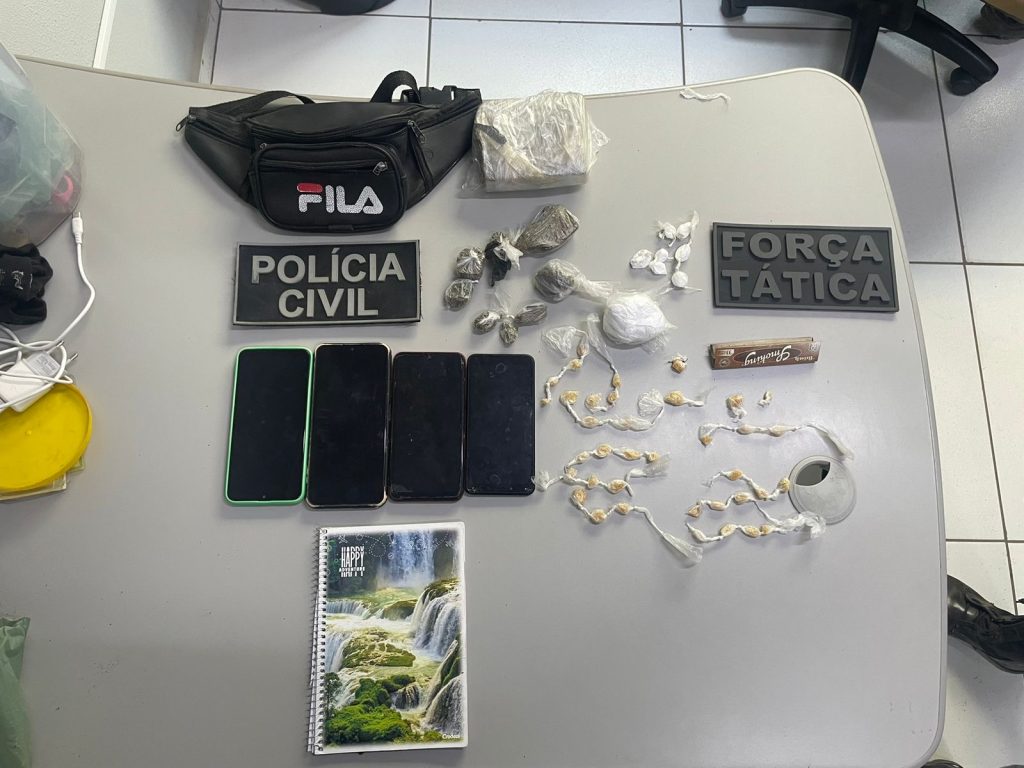 De acordo com o delegado Vinicius Araújo, no local, as equipes policiais prenderam R.M. de S., que, segundo investigações, praticava o crime de tráfico de drogas.