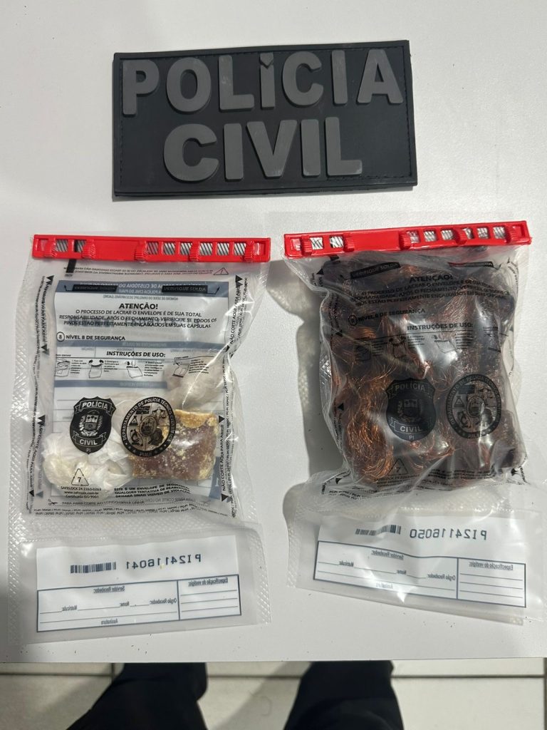 Segundo o delegado Walter Cunha, foram apreendidos dois invólucros de uma substância análoga à cocaína-crack e uma pedra grande, que subdividida é possível chegar a dezenas de unidades de uso individual para consumo de crack, na posse de um casal de iniciais S.N. C. (homem) e E.M. da S. (mulher). O casal foi preso em flagrante pelos crimes de tráfico de drogas e associação para o tráfico.