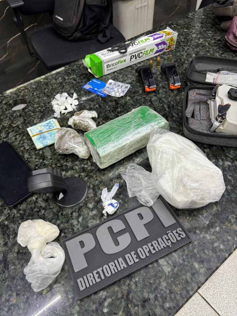 “Logo em seguida foi feito deslocamento à casa dele onde foi apreendida quantidade de maconha e cocaína significativa, além de um drone. Além do mandado, K.S. de S. foi preso em flagrante delito por tráfico de drogas e posse irregular de munições e acessórios”, informou o delegado.