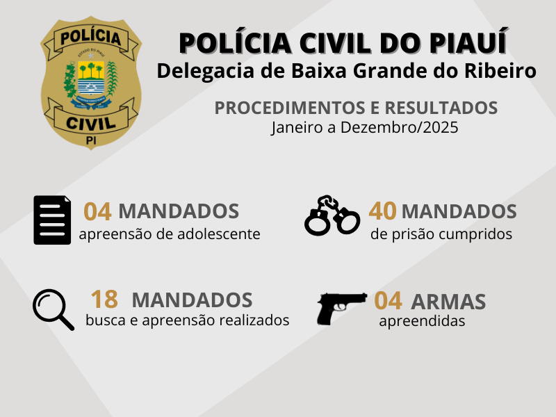 A Polícia Civil do Piauí, por meio da Delegacia de Baixa Grande do Ribeiro, divulga os números referentes à unidade ao longo de 2025. Os dados refletem o trabalho contínuo e integrado desenvolvido pela delegacia no município.