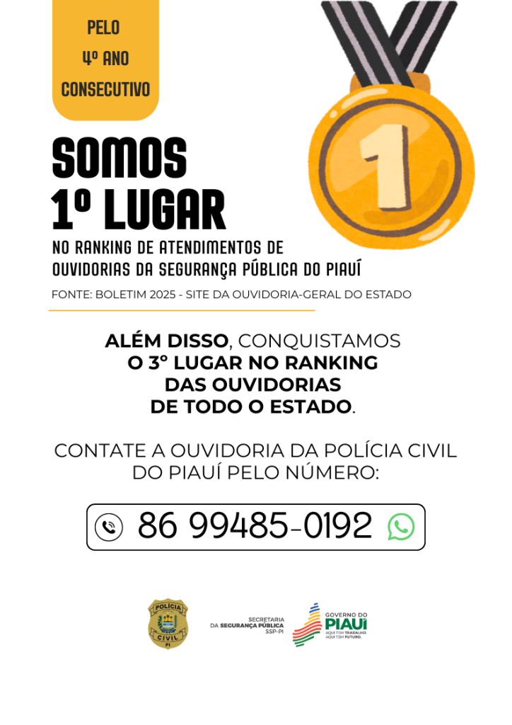 A Polícia Civil do Piauí (PC-PI) ocupa, pela 4ª vez consecutiva, o 1º lugar no ranking de ouvidorias setoriais, no caso entre as ouvidorias dos órgãos de segurança pública do estado, segundo números divulgados acerca do último ano. Com mais de 2 mil atendimentos realizados em 2025, a Ouvidoria da PC-PI ocupa também o 3º lugar no ranking de atendimentos das ouvidorias de todo o Piauí. Os dados constam no Boletim Anual de 2025 da Ouvidoria-Geral do Estado.