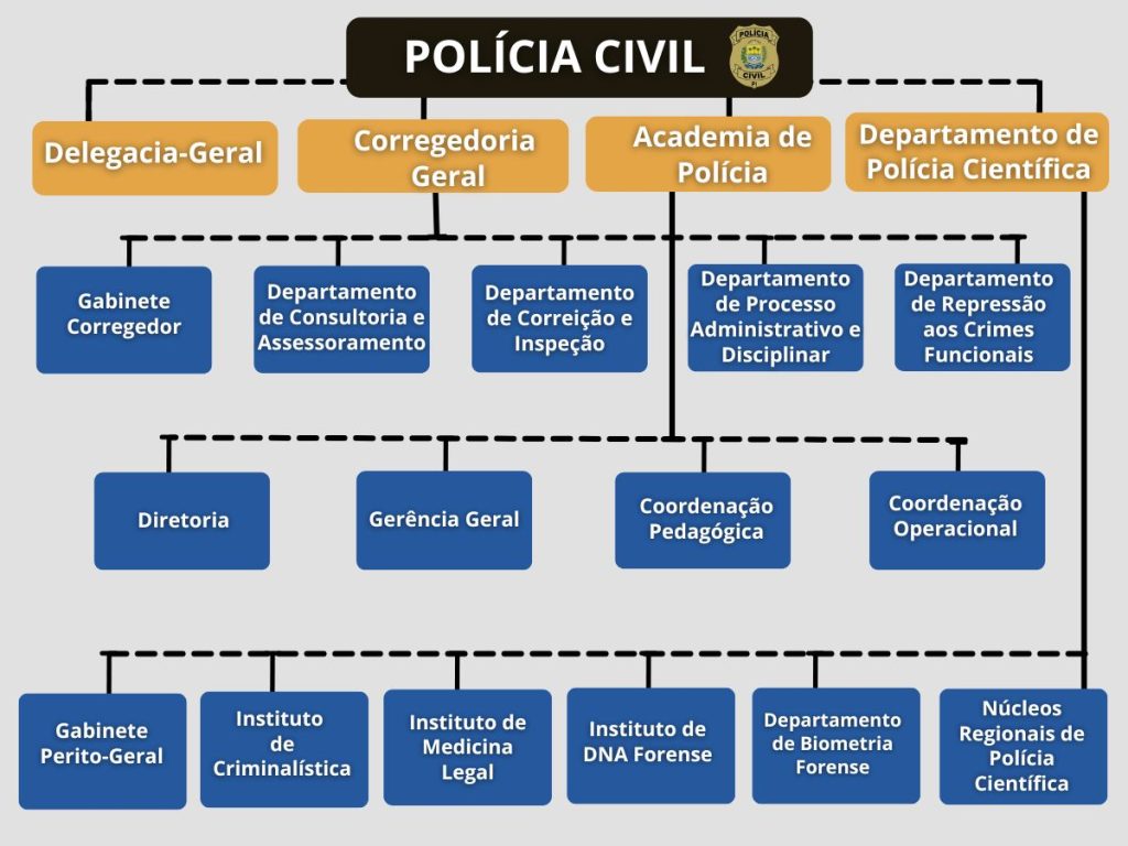 - A Corregedoria-Geral da Polícia Civil (CGPC) é dirigida pelo Corregedor-Geral tem a seguinte estrutura: I – Gabinete do Corregedor; II – Departamento de Consultoria e Assessoramento; III – Departamento de Correição e Inspeção; IV – Departamento de Processo Administrativo e Disciplinar.