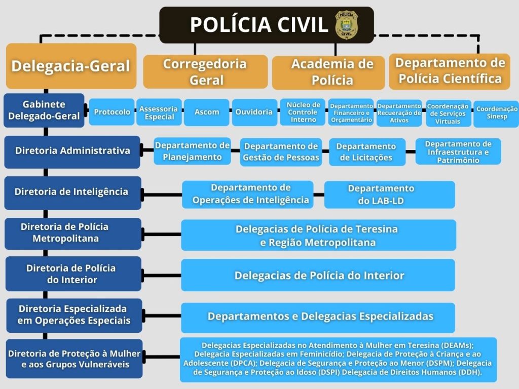 - A Delegacia-Geral (DGPC) é dirigida pelo Delegado-Geral da Polícia Civil do Piauí.