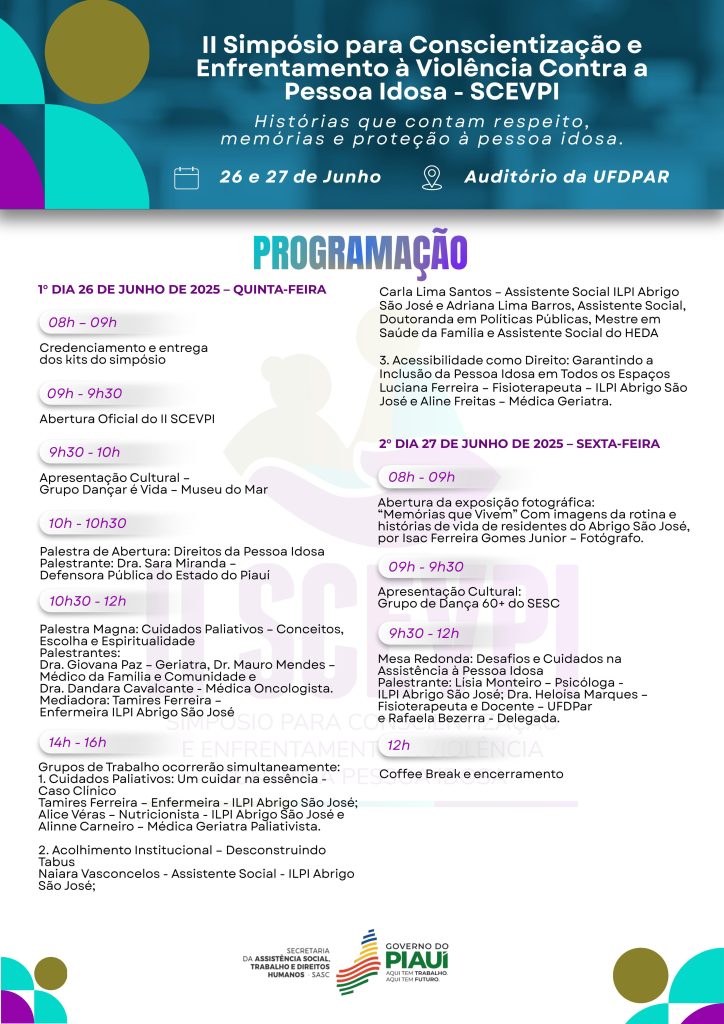 A Secretaria de Desenvolvimento e Assistência Social, Família e Combate à Fome (Sasc) está realizando uma série de ações dentro da campanha Junho Violeta, mês de conscientização e combate a violência contra os idosos. Entre as iniciativas, destaca-se o II Simpósio para Conscientização e Enfrentamento à Violência contra a Pessoa Idosa, que ocorrerá, nos dias 26 e 27 de junho, no auditório central da Universidade Federal do Delta do Parnaíba, em Parnaíba (PI).
