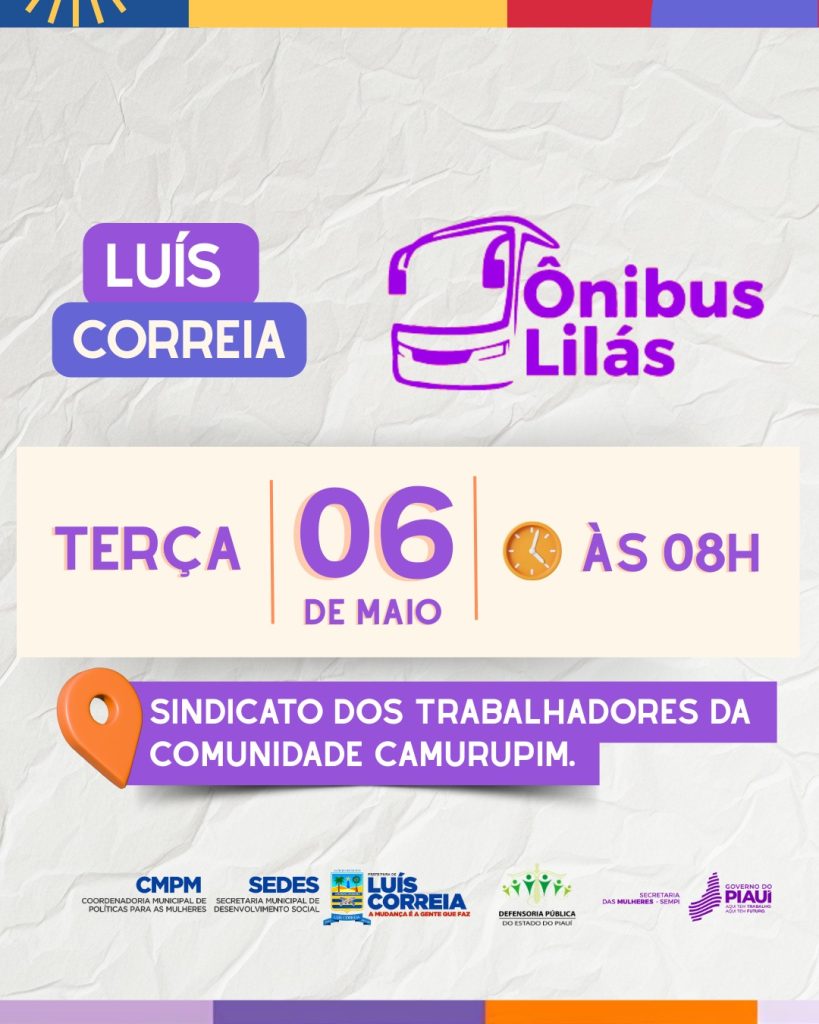 Os Ônibus Lilás irão iniciar a rota do mês de maio pela planície litorânea. Nesta terça-feira (06), a cidade contemplada será Luís Correia, com serviços disponíveis a partir das 8h no Sindicato dos Trabalhadores, da comunidade Camurupim.