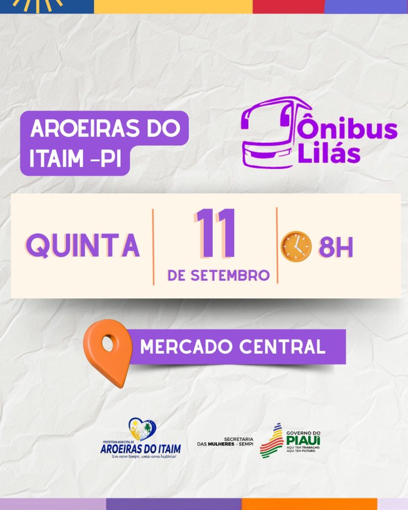 Nesta quinta-feira (11), o município de Aroeiras do Itaim recebe a visita do Ônibus Lilás, projeto itinerante da Secretaria das Mulheres do Piauí (SEMPI) que percorre o estado levando informação, acolhimento e serviços às mulheres. A ação acontecerá no Mercado Central, a partir das 8h.