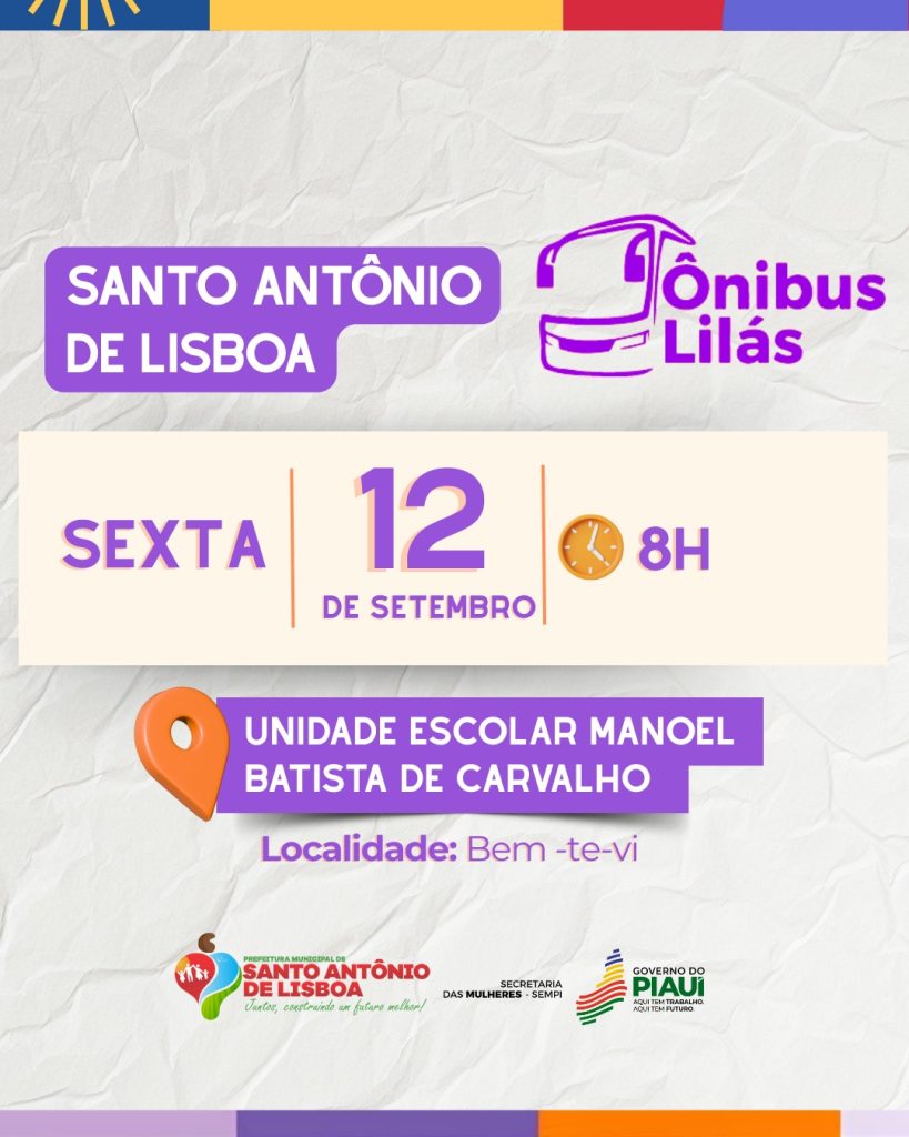 A Secretaria das Mulheres do Piauí (SEMPI) realiza, nesta sexta-feira (12), mais uma ação itinerante do Ônibus Lilás, desta vez no município de Santo Antônio de Lisboa, localidade Bem-te-vi. A atividade será realizada na Unidade Escolar Manoel Batista de Carvalho, a partir das 8h, oferecendo serviços gratuitos à comunidade, em especial às mulheres.