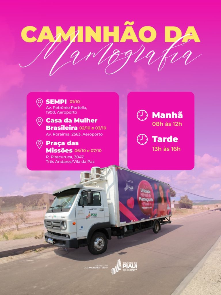 A Secretaria das Mulheres do Piauí (SEMPI) e a Casa da Mulher Brasileira irão receber, na próxima semana, o Caminhão da Mamografia da Secretaria de Estado da Saúde (Sesapi). A ação integra a programação do Outubro Rosa, campanha de conscientização e prevenção ao câncer de mama.