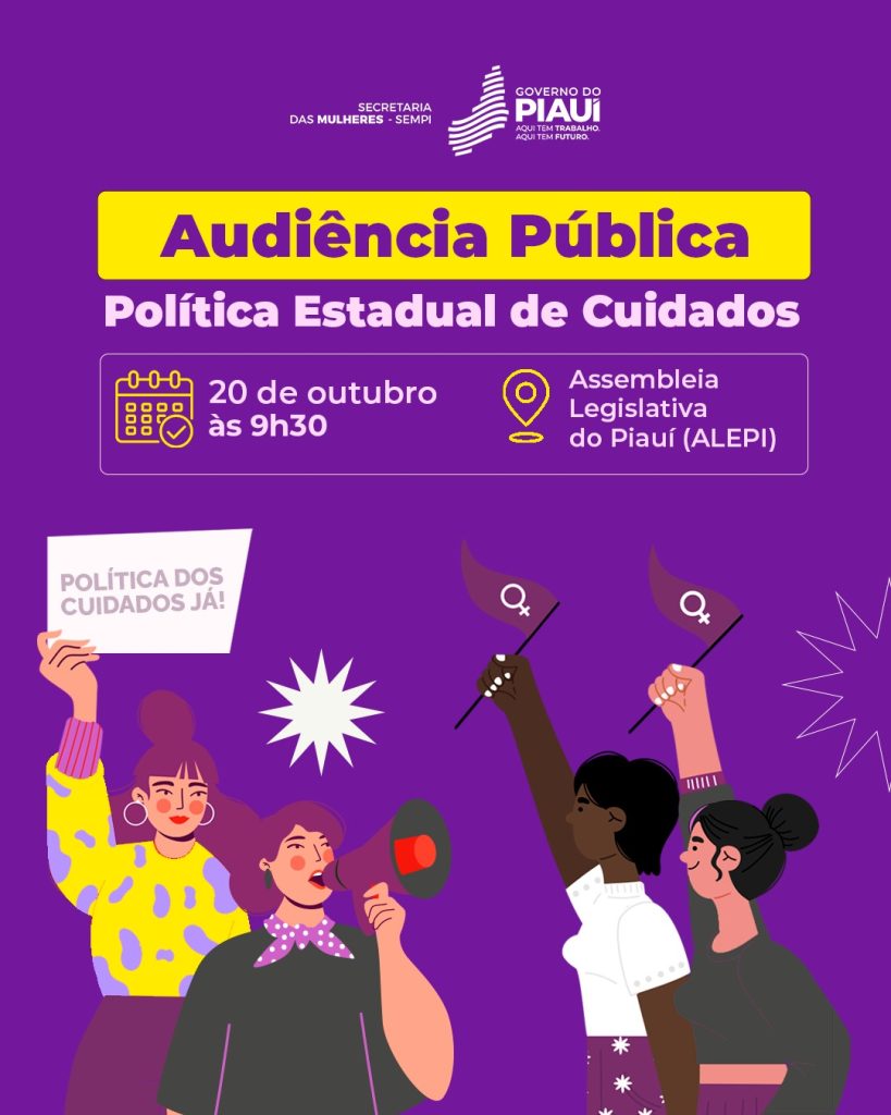 A Secretaria das Mulheres do Piauí (SEMPI) convida toda a sociedade civil para participar de uma audiência pública na Assembleia Legislativa do Piauí (Alepi), no dia 20 de outubro, a partir das 9h30, que discutirá a elaboração do Projeto de Lei que instituirá a Política Estadual de Cuidados.