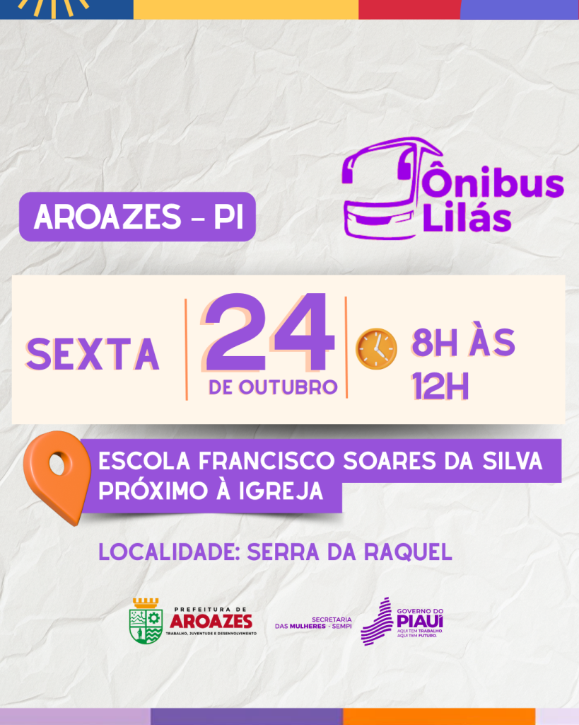 A Secretaria das Mulheres do Piauí (SEMPI) realiza, nesta sexta-feira (24), mais uma ação do Ônibus Lilás, desta vez no município de Aroazes. As atividades acontecerão das 8h às 12h, na Escola Francisco Soares da Silva, localizada na Serra da Raquel, próximo à igreja.