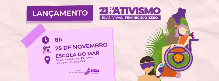 A Secretaria das Mulheres do Piauí (SEMPI) lança, no dia 25 de novembro, a Campanha dos 21 Dias de Ativismo pelo Fim da Violência contra as Mulheres, em parceria com as secretarias estaduais de Educação (SEDUC) e Segurança Pública (SSP). A abertura será realizada na Escola do Mar, em Luís Correia, a partir das 8h, e contará também com a participação da prefeitura municipal e da Universidade Federal do Delta do Parnaíba (UFDPar).