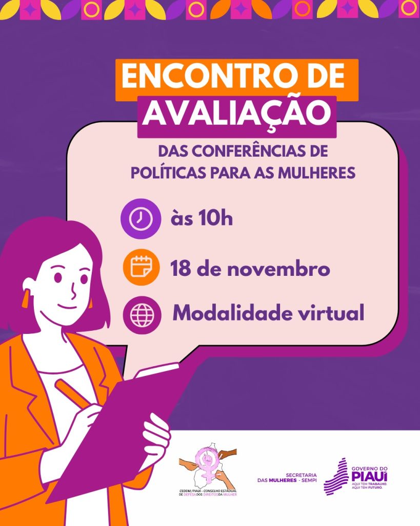 Nesta terça-feira (18), a Secretaria das Mulheres do Piauí (SEMPI), em parceria com a mesa diretora do Conselho Estadual de Defesa dos Direitos da Mulher (CEDDM/PI), promove o Encontro de Avaliação das Conferências Estadual e Nacional de Política para as Mulheres.