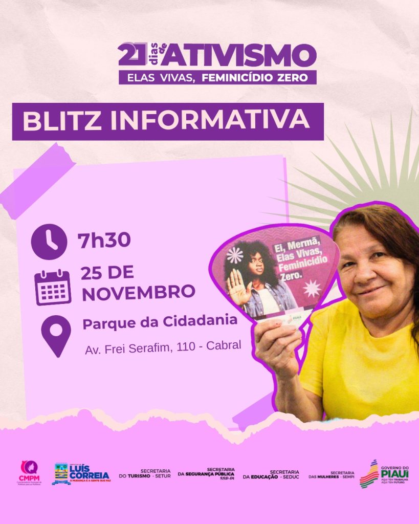 A Secretaria das Mulheres do Piauí (SEMPI) realiza, nesta terça-feira (25), a partir das 7h30, uma Blitz Informativa no Parque da Cidadania, com o objetivo de levar orientação, acolhimento e informação à população sobre o enfrentamento à violência contra as mulheres.