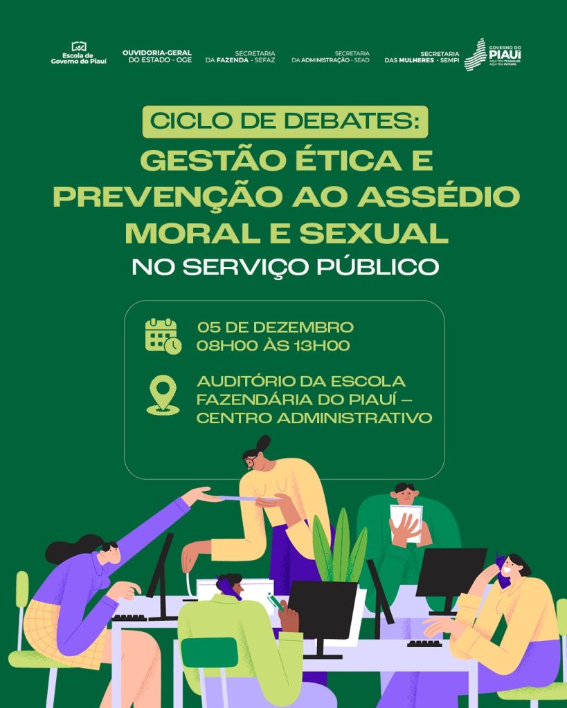 No dia 5 de dezembro, a Secretaria das Mulheres do Piauí (SEMPI), em parceria com a Secretaria de Estado da Administração, por meio da Escola de Governo, a Ouvidoria Geral do Estado e a Controladoria Geral do Estado, realiza o “Ciclo de Debates: Gestão Ética e Prevenção ao Assédio no Serviço Público”. O evento será realizado no Auditório da Escola Fazendária, das 8h às 13h, e é direcionado a gestores e gestoras dos órgãos e entidades do Governo do Estado do Piauí.