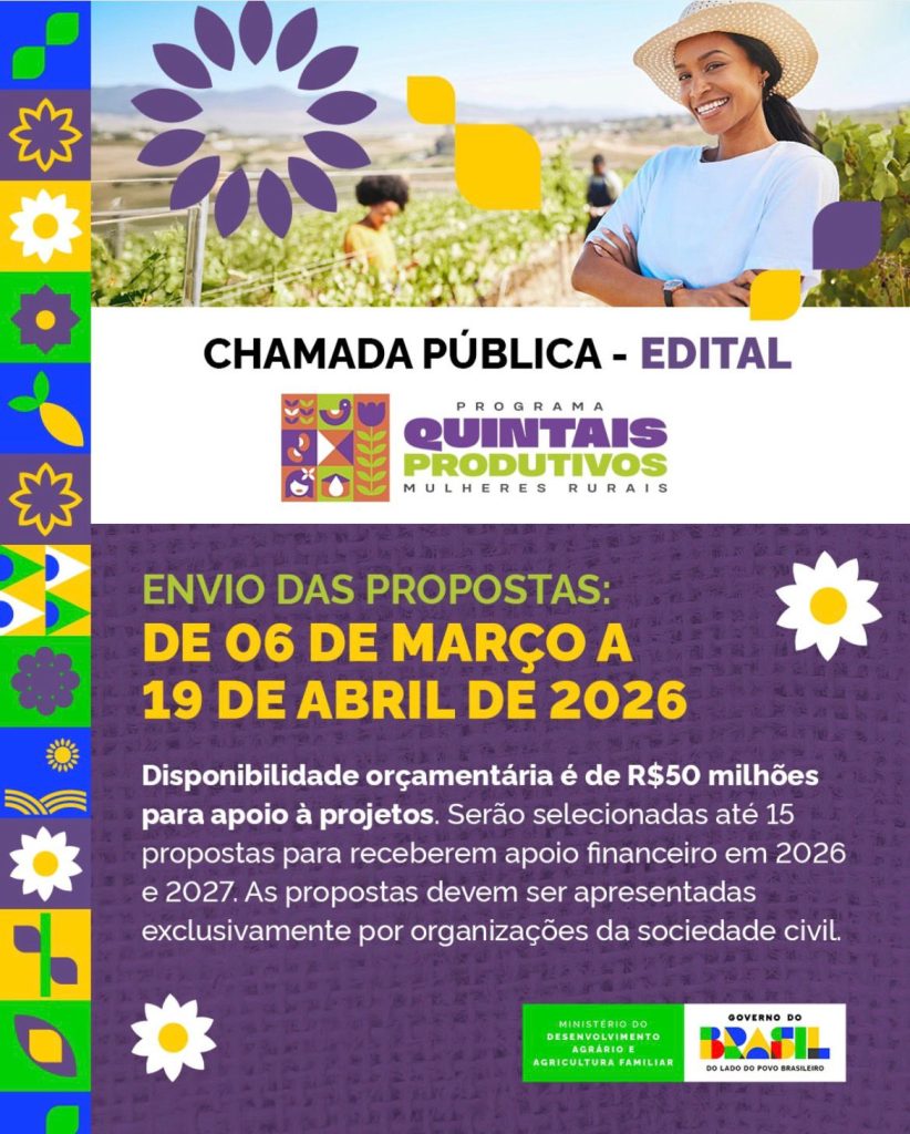 A Secretaria das Mulheres do Piauí (SEMPI) divulga o lançamento do Edital de Chamamento Público nº 01/2026, iniciativa do Ministério do Desenvolvimento Agrário e Agricultura Familiar (MDA), por meio da Subsecretaria de Mulheres Rurais (SMR), que tem como objetivo apoiar projetos voltados à implantação de quintais produtivos e ao fortalecimento da organização produtiva de mulheres em todo o Brasil.