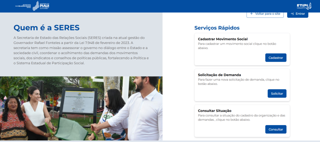 O Sistema de Atendimento aos Movimentos Sociais (SIAMOS), foi desenvolvido pela Empresa de Tecnologia da Informação do Piauí (ETIPI), em parceria com a SERES, com o objetivo de facilitar o acesso da sociedade civil organizada aos serviços oferecidos pelo governo do Estado.