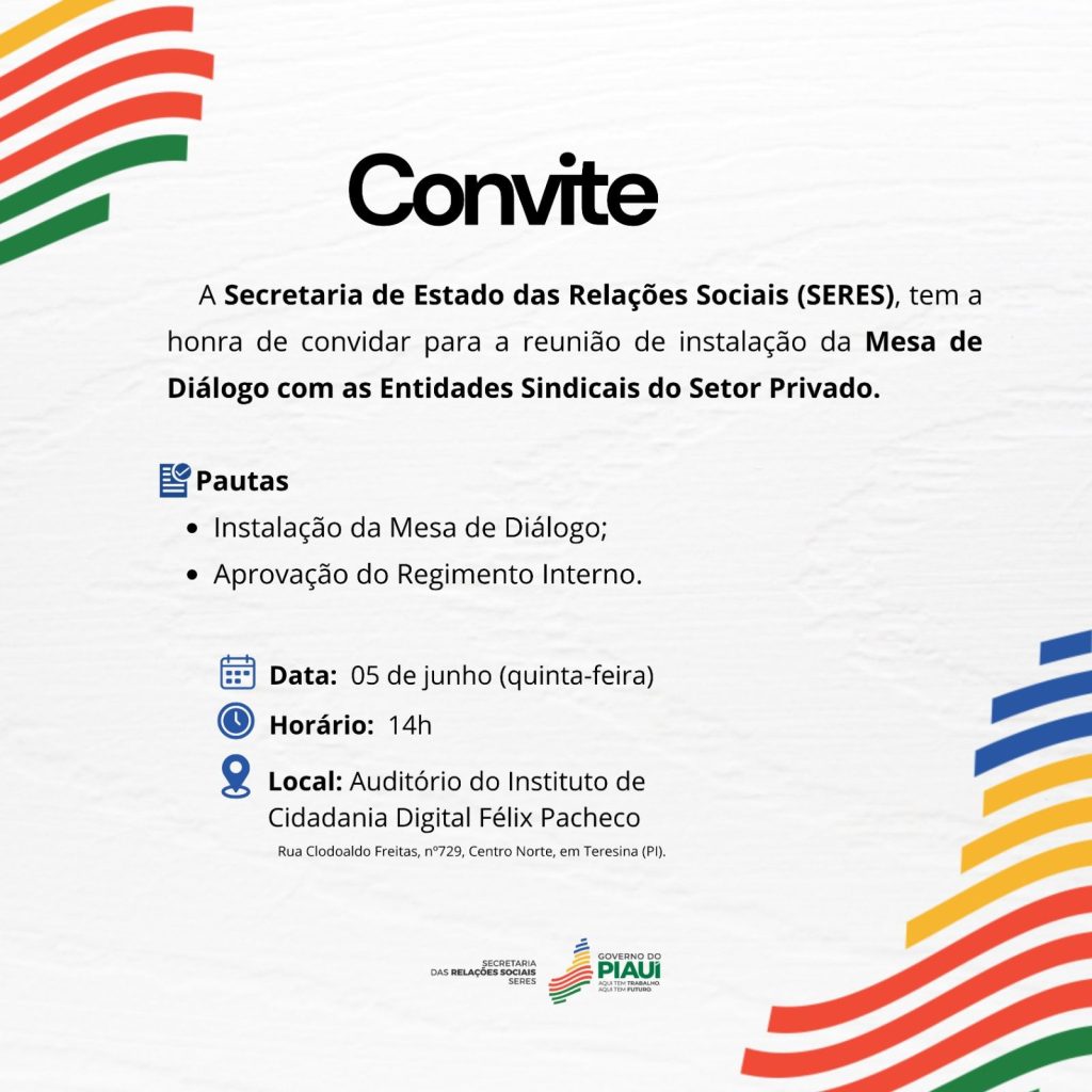 De acordo com a Portaria Nº 3, de 23 de maio de 2025, foram estabelecidas as diretrizes e regras gerais para organização e funcionamento da Mesa de Diálogo entre o Governo do Estado do Piauí e os Trabalhadores do Setor Privado – MESP, mecanismo permanente de diálogo com as entidades representativas das categorias de trabalhadores do setor privado e o poder público, que integra o Sistema Estadual de Participação Social – SEPS, instituído pela Lei nº 7.357, de 03 de fevereiro de 2020, alterada pela Lei nº 8.333, de 05 de abril de 2024.