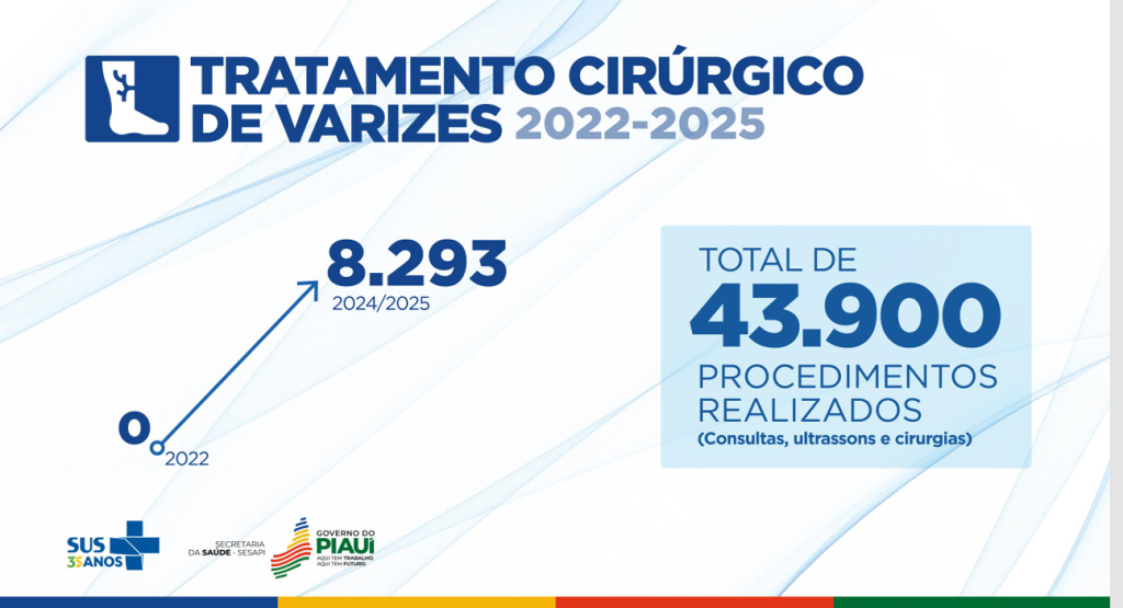 O Piauí registrou um avanço expressivo no tratamento cirúrgico de varizes, uma iniciativa que vem transformando o acesso à saúde vascular no estado. Em 2022, quando o serviço começa a ser estruturado, não havia registros de atendimentos para essa condição. Já nos anos de 2024/2025, mais de 8.293 pacientes foram atendidos, consolidando a campanha como um dos maiores sucessos recentes da saúde pública estadual. Ao todo, mais de 43 mil procedimentos foram realizados, incluindo consultas, exames de ultrassom e cirurgias diretamente ligadas ao tratamento de varizes, beneficiando milhares de piauienses.
