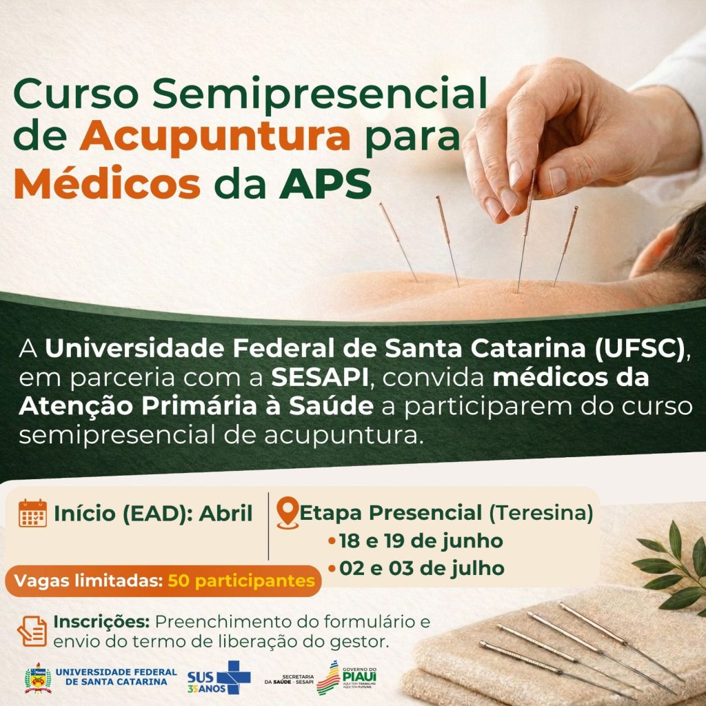 A Secretaria de Estado da Saúde do Piauí (Sesapi), por meio da Gerência de Atenção Primária, em parceria com a Universidade Federal de Santa Catarina (UFSC), está ofertando o Curso de Acupuntura para Médicos da Atenção Primária à Saúde (APS). A iniciativa faz parte das estratégias de fortalecimento das Práticas Integrativas e Complementares em Saúde (PICS) no estado.